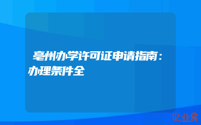 - 亳州办学许可证申请指南:办理条件全解析一、引言随着教育行业的迅速发展,越来越多的教育机构在亳州地区开展业务。为了确保教育质量和机构合法性,申请办学许可证已成为必要流程。本文将详细解析亳州办学许可证的办理条件,帮助申请者全面了解并顺利获得许可