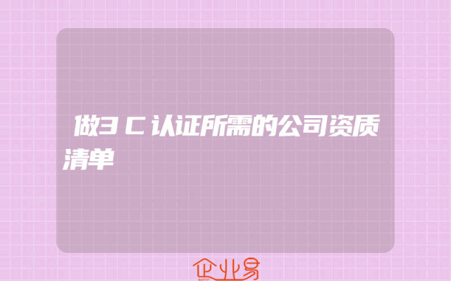- 好的,根据您的要求,我将撰写一篇关于办理3C认证所需的公司资质清单的文章。以下是文章的详细内容:办理3C认证所需的公司资质清单在中国的市场环境下,办理产品的3C认证是企业获得市场竞争力的重要手段。但申请过程中,企业需要准备一系列的资质和文件