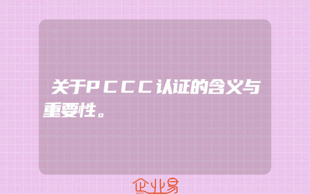- 好的,关于PCCC认证的含义与重要性一、PCCC认证的含义PCCC认证,全称为专业认证中心认证,是一种针对企业产品或服务质量的权威性评价。该认证旨在确保企业提供的商品和服务满足既定的标准,从而为消费者提供高质量的体验。通过此认证的企业和产品