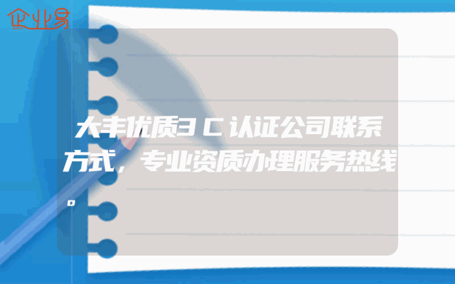 - 大丰优质3C认证公司联系方式:专业资质办理服务热线一、引言在中国,企业想要赢得市场的信任和立足,拥有合规的资质认证是必不可少的一环。作为专业企业服务行业的从业者,我们深知各类企业资质办理的重要性和复杂性。在这篇文章中,我们将重点介绍大丰优质