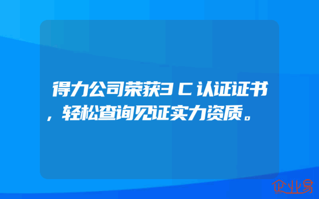 - 得力公司荣获3C认证证书,轻松查询见证实力资质荣誉证书彰显实力近日,得力公司成功荣获了3C认证证书,这是对公司长期以来在产品质量、安全管理、服务水平等方面的肯定与表彰。对于企业来说,3C认证不仅是国家