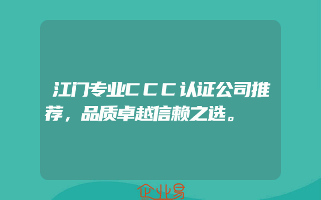 - 江门专业CCC认证公司推荐:品质卓越信赖之选一、引言在中国市场,各类认证日益受到企业的重视,其中CCC认证作为中国强制性产品认证,更是企业进入市场的必备资质。对于江门地区的企业而言,寻找一家专业的CCC认证公司至关重要。本文将为您推荐一家品