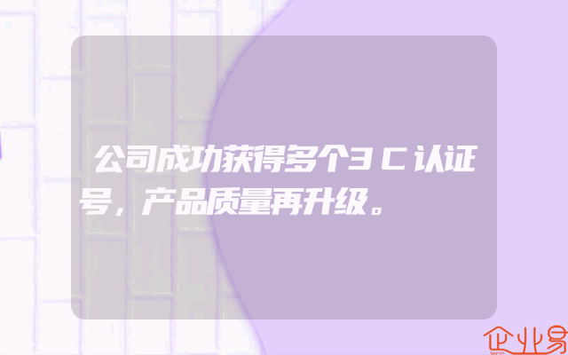 - 公司成功获得多个3C认证号,产品质量再升级一、企业荣誉:多个3C认证号的成功获得近日,我们公司迎来一项重要的里程碑,成功获得了多个3C认证号。这是对我们企业不懈努力的肯定,也是对我们产品质量的最高赞誉。3C认证,作为中国强制性的产品认证,对