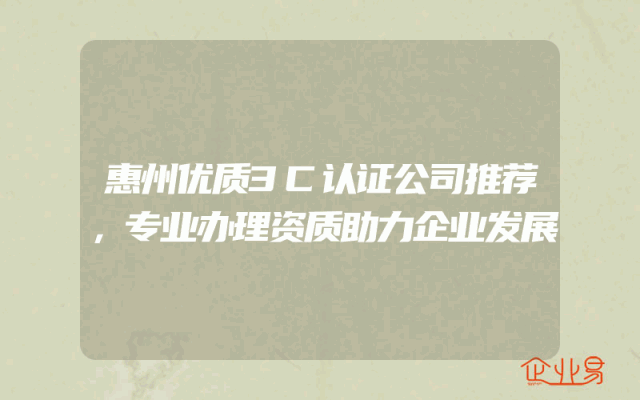 - 惠州优质3C认证公司推荐:专业办理资质助力企业发展一、引言随着市场竞争日益激烈,企业的规范化管理和品质保证显得尤为重要。在这个过程中,取得各类必要的资质认证,不仅关乎企业的合法运营,更是提升市场竞争力的重要手段。在惠州地区,有许多优