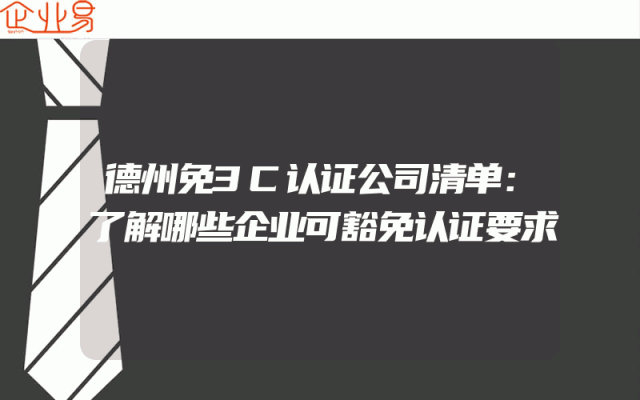 - 德州免3C认证公司清单:了解哪些企业可豁免认证要求一、引言随着市场规范化进程的不断推进,各类企业面临着日益严格的监管环境。其中,3C认证作为企业产品进入市场的必要门槛之一,对于企业的运营和发展具有重要影响。然而,在德州地区,部分企业