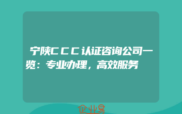 - 宁陕CCC认证咨询公司一览:专业办理,高效服务了解宁陕CCC认证咨询公司在企业和机构的日常运营中,资质办理是不可或缺的一环。作为专业的企业服务行业从业者,宁陕CCC认证咨询公司深知各类企业资质办理的