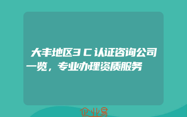 - 大丰地区3C认证咨询公司一览:专业办理资质服务一、引言随着市场竞争的日益激烈,企业为了提升自身竞争力,不断追求规范化、标准化发展。在这个过程中,各类资质认证成为了企业发展的重要支撑。位于大丰地区的众多企业中,有许多需要提供3C认证和其他相关
