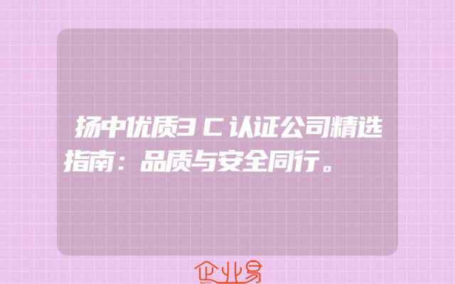 - 扬中优质3C认证公司精选指南:品质与安全同行一、引言随着科技的飞速发展,扬中地区的众多企业以高品质的产品和服务赢得了广大客户的信赖。在这个充满竞争的市场环境中,如何选择一家具有优质服务的3C认证公司显得尤为重要。本文将带您了解扬中地区优质的