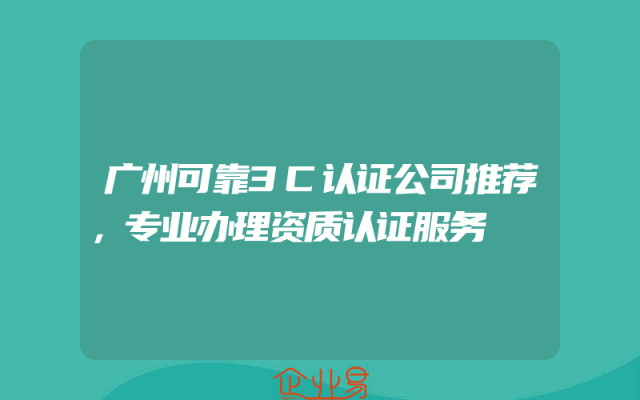 - 广州可靠3C认证公司推荐——专业办理资质认证服务一、广州可靠3C认证公司概述在广州这座充满活力的城市,有许多专业的企业服务机构提供资质认证服务。其中,一家值得推荐的可靠公司是专门办理企业资质认证的机构。该公司致力于为企业提供一站式的资质认证