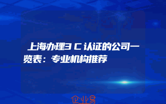 - 上海办理3C认证的公司一览表:专业机构推荐引言随着市场竞争的加剧,企业对于产品质量和安全的重视程度越来越高。在中国,3C认证作为一种重要的产品质量认证制度,已经成为企业进入市场的必备条件之一。在上海,许多