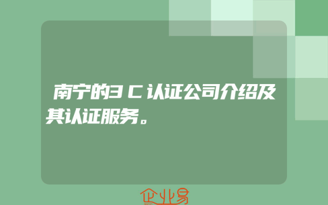 - 南宁3C认证公司介绍及其认证服务一、南宁3C认证公司介绍南宁作为广西壮族自治区的首府,近年来经济发展迅速,吸引了众多企业进驻。在这座充满活力的城市,有一家专门从事3C认证的机构——南宁3C认证公司。该公司具备深厚的专业知识和丰富的实践经验,