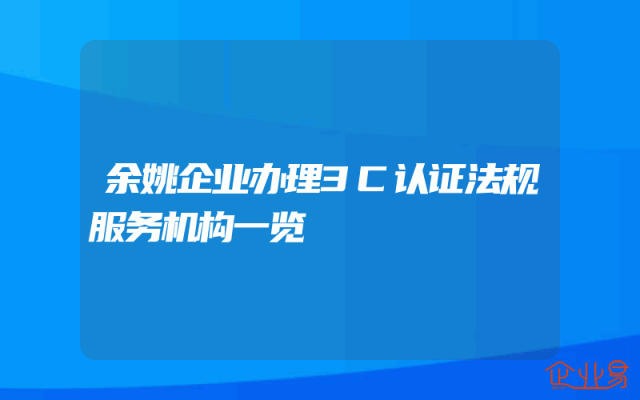 - 余姚企业办理3C认证法规服务机构一览一、引言随着市场规范化与国际化趋势的加强,产品质量认证成为企业进入市场的必备条件之一。在余姚地区,众多企业为提升产品竞争力、确保质量安全,纷纷寻求办理3C认证(中国强制认证)。本文将详细介绍余姚企业办理3