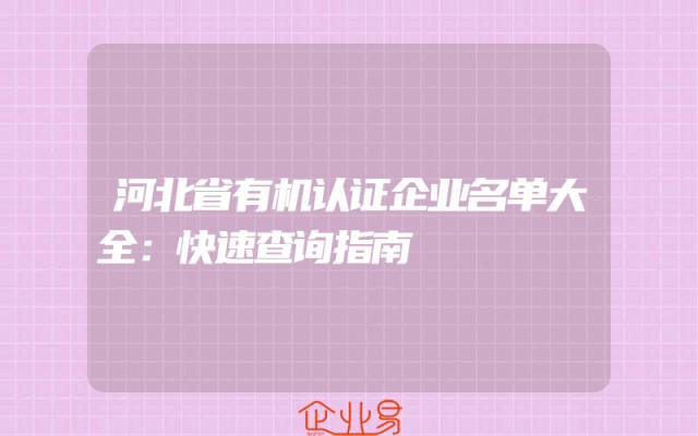 - 河北省有机认证企业名单大全:快速查询指南一、河北省有机认证概述河北省是我国农业生产的重要基地之一,有机农业的发展也取得了长足的进步。越来越多的企业开始注重有机产品的生产,并通过有机认证来确保产品质量。本指南旨在为广大消费者和企业提供河北省有