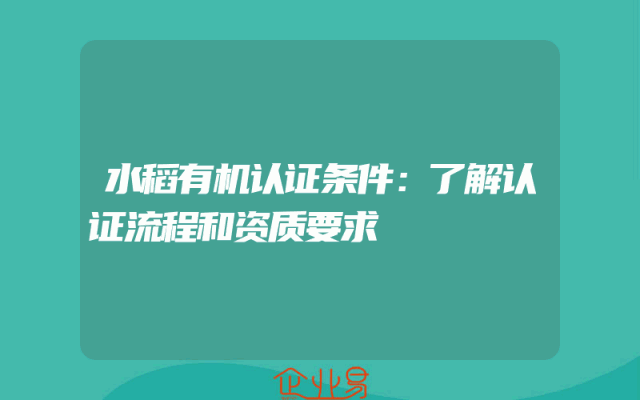- 水稻有机认证条件解析:了解认证流程和资质要求一、引言随着人们对食品安全和环保意识的日益提高,有机农业在全球范围内得到了迅速发展。水稻作为我国的主要粮食作物之一,其有机种植和认证也逐渐受到广泛关注。本文将详细解析水稻有机认证的流程和资质要求,
