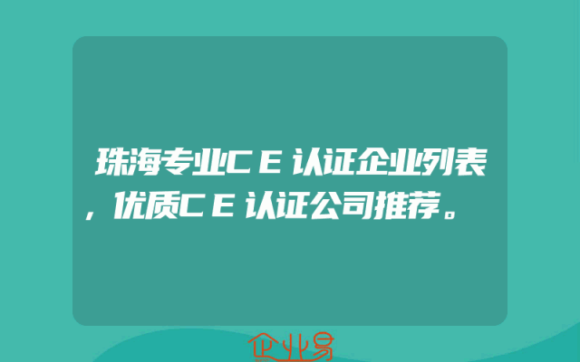 - 珠海专业CE认证企业列表及优质CE认证公司推荐在珠海这座繁荣的城市中,许多企业为了提升自身品质和市场竞争力,积极参与国际认证,其中CE认证尤为受到重视。本文将为您列举珠海的专业CE认证企业,并推荐一些优质的CE认证公司,以帮助您更好地了解并