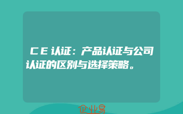 - CE认证:产品认证与公司认证的区别与选择策略一、引言随着国际贸易的不断发展,产品认证和公司认证成为了企业进入欧洲市场的关键路径。其中,CE认证是欧洲市场的一项强制性认证,涉及产品和公司的不同认证方式。本文将详细解析产品认证与公司认证的区别,