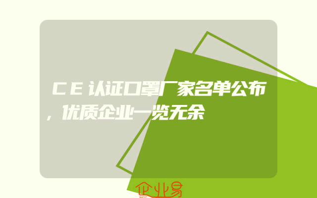- CE认证口罩厂家名单公布,优质企业一览无余一、CE认证的重要性在当前全球疫情严峻的环境下,口罩成为了日常生活中不可或缺的重要物资。而CE认证则代表着口罩产品的安全、质量与标准的保障。获得CE认证的口罩厂家,其产品意味着符合欧盟的法规