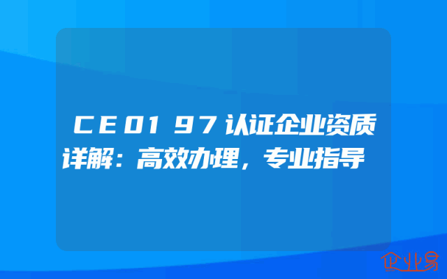 - CE0197认证企业资质详解:高效办理,专业指导一、CE0197认证简介在现代企业运营中,各类认证已成为评估和提升企业综合实力的重要标准。CE0197认证是其中一种针对企业特定领域资质的重要认证,旨在确保企业在特定业务领域具备专业能力和合规