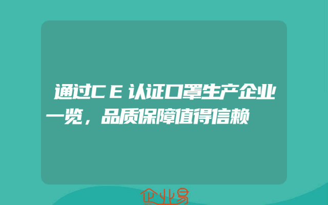 - 通过CE认证口罩生产企业一览:品质保障值得信赖一、CE认证与口罩品质保障的关联在当前全球健康意识日益增强的背景下,口罩作为个人防护用品的重要一环,其品质保障至关重要。其中,CE认证作为一种重要的质量认证标准,对于口罩生产企业的产品安全性和可
