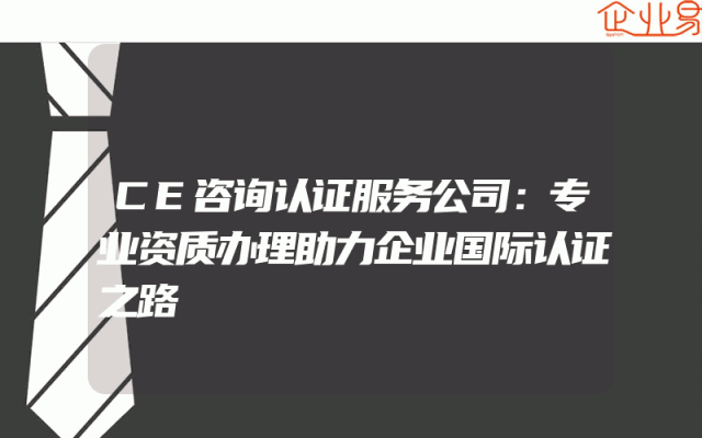 - CE咨询认证服务公司:专业资质办理助力企业国际认证之路一、引言随着全球化的不断推进,越来越多的企业意识到国际认证的重要性。这些认证不仅代表着企业的实力,也是企业在国际市场上取得优势的关键。CE咨询认证服务公司,作为一家专业的资质办理服务机构