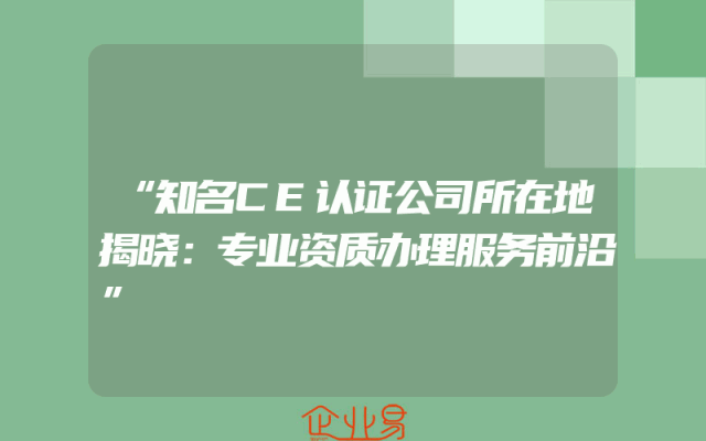 - 知名CE认证公司所在地揭晓:专业资质办理服务前沿一、认证公司总览在众多权威的企业服务行业中,知名CE认证公司凭借其专业资质办理服务,在业界树立起了标杆。该公司凭借其卓越的信誉和一流的服务,为企业家的业务活动提供了强有力的支持。无论是企业的日