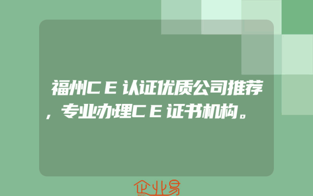 - 福州CE认证优质公司推荐:专业办理CE证书机构一、引言随着国际贸易的不断发展,产品出口到欧洲市场已成为众多企业的必然选择。作为欧洲市场的准入证,CE认证的重要性日益凸显。在福州,有不少专业的机构致力于为企业提供专业、高效的CE认证服
