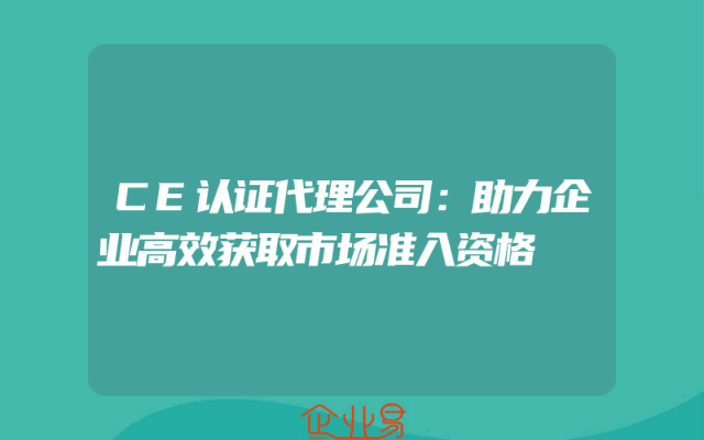 - CE认证代理公司:助力企业高效获取市场准入资格一、引言随着国际贸易的日益繁荣,欧洲市场成为了众多企业的必争之地。为了顺利进入欧洲市场,企业必须要获得CE认证,这是产品进入欧盟市场的通行证。然而,申