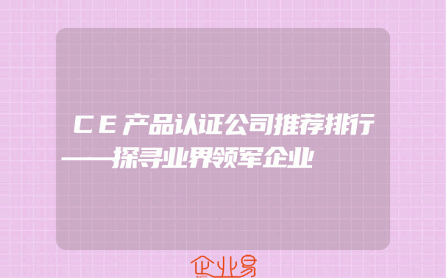 - CE产品认证公司推荐排行——探寻业界领军企业一、引言随着欧洲市场的日益开放和全球化的推进,CE认证成为了产品进入欧洲市场的必备条件。选择一家优秀的CE产品认证公司,对于企业的产品推广和品牌建设至关重要。本文将为您深入解读业界领先的CE产品认