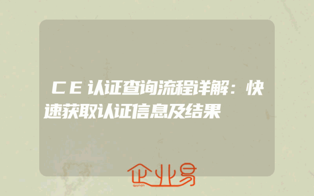 - CE认证查询流程详解:快速获取认证信息及结果一、了解CE认证概述CE认证是欧洲市场针对产品安全与健康的重要认证标准,对于想要进入欧洲市场的企业来说,了解CE认证的查询流程至关重要。CE认证不仅涉及产品的安全性和合规性,也是企业信誉和市场竞争