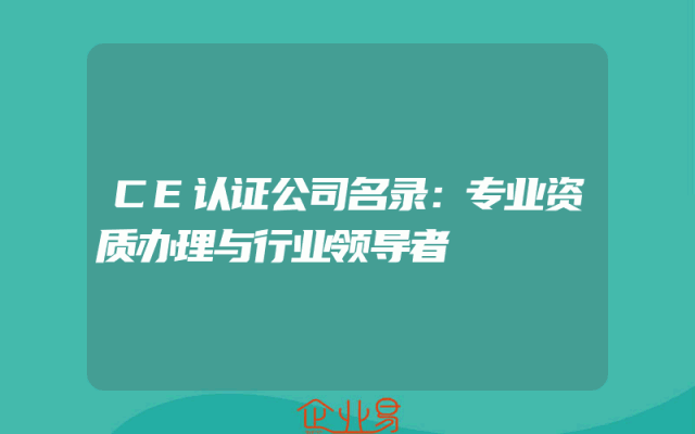 - CE认证公司名录:专业资质办理与行业领导者一、引言随着欧盟市场的日益开放和国际贸易的繁荣,CE认证成为了产品进入欧洲市场的通行证。为了助力企业顺利拓展欧洲市场,众多专业办理CE认证的公司应运而生,它们不仅提供全方位的资质办理服务,还