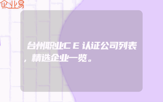 - 台州职业CE认证公司列表,精选企业一览一、引言随着全球化的进程加速,企业对产品质量和安全的关注度日益提高。为满足市场日益增长的需求,越来越多的企业选择寻求专业认证,以确保产品和服务达到国际先进标准。在中国,特别是在台州这样的经济活跃地区,涌