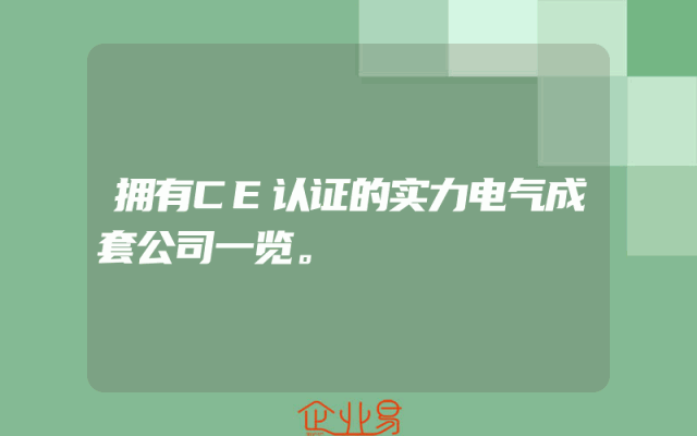 - 拥有CE认证的实力电气成套公司一览一、引言随着电气行业的快速发展,越来越多的电气成套公司涌现出来。在这些公司中,拥有CE认证的公司凭借其高品质的产品和服务,赢得了广大客户的信赖。CE认证作为欧盟的强制性安全认证,对于电气产品的质量和安全性有