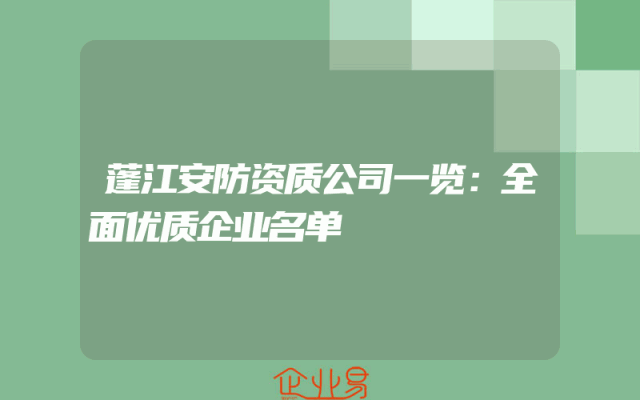 - 蓬江安防资质公司一览:全面解析优质企业名单一、安防行业概述随着社会的快速发展,安防行业在保障国家安全、维护社会秩序等方面发挥着重要作用。蓬江区作为安防产业的重要集聚地,拥有众多优质安防企业。本文将为您