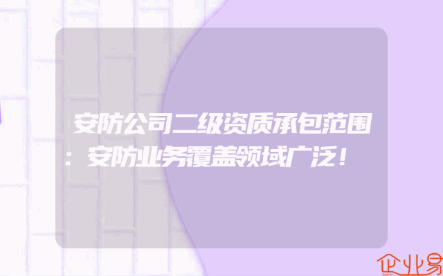 - 安防公司二级资质承包范围详解:安防业务覆盖领域广泛!一、引言随着社会的不断发展,安防行业作为保障社会公共安全的重要力量,其业务范围也在不断扩展。对于拥有二级资质的安防公司来说,其承包范围更是广泛,涵盖了多个领域,为社会的安全稳定发挥着重要作