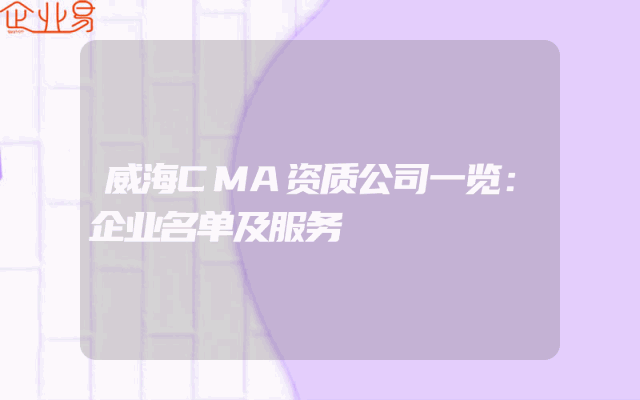 - 威海CMA资质公司一览:企业名单及服务解析一、威海CMA资质公司概览威海作为经济快速发展的城市,拥有众多优秀的CMA资质公司。这些企业凭借专业的服务能力和高度的信誉,为企业提供全方位的资质办理、咨询和认证服务。二、企业名单以下是威海部分具有