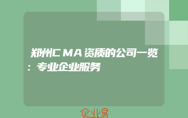 - 郑州CMA资质的公司一览:专业企业服务解析一、郑州CMA资质公司概述在郑州,拥有CMA资质的公司为企业提供了一系列专业的服务,包括但不限于财务审计、税务咨询、内部控制等方面。这些公司凭借着专业的团队和丰富的经验,帮助企业满足相关政策和法规的