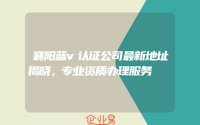 - 襄阳蓝V认证公司最新地址揭晓,专业资质办理服务解析一、蓝V认证公司最新地址揭晓近日,广大企业朋友密切关注的话题之一,便是襄阳蓝V认证公司的最新地址。对于众多需要办理企业资质的客户来说,新的办公地点不仅代表了公司的新起点,也体现了其持