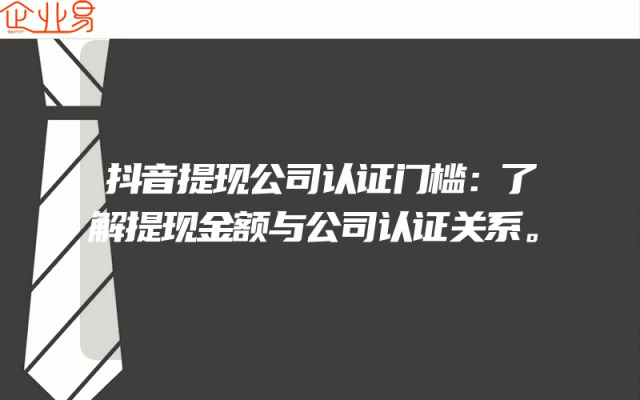 - 抖音提现公司认证门槛:了解提现金额与公司认证关系一、抖音平台与提现公司概述随着移动互联网的飞速发展,抖音作为社交娱乐的重要平台之一,吸引了大量个人用户和企业的关注。越来越多的企业选择在抖音上开设账号进行品牌推广和产品营销。因此,提现公司作为