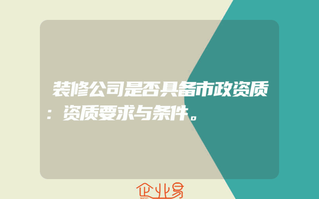 - 装修公司是否具备市政资质:解析资质要求与条件一、引言在装修行业中,对于涉及市政工程的公司,资质要求显得尤为重要。随着城市建设的不断推进,市政工程项目日益增多,装修公司若具备市政资质,便能更好地参与市场竞争,提供更高质量的服务。本文将详细解析