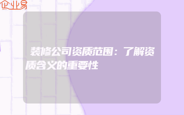 - 装修公司资质范围解析:了解资质含义的重要性一、装修公司资质概述在装修行业,资质是评价一家公司综合实力和专业水平的重要指标。随着市场规范化管理的加强,了解装修公司的资质范围变得尤为重要。这不仅关乎消费者的权益保障,也是企业诚信经营的基础。二、