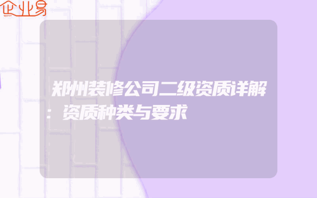- 郑州装修公司二级资质详解:资质种类与要求一、郑州装修公司二级资质概述在郑州,从事装修行业的公司必须具备相应的资质,以确保工程质量和行业秩序。其中,二级资质是装修公司追求的常见资质之一,代表着公司的综合实力和专业水平。本文将详细解析郑州装修公