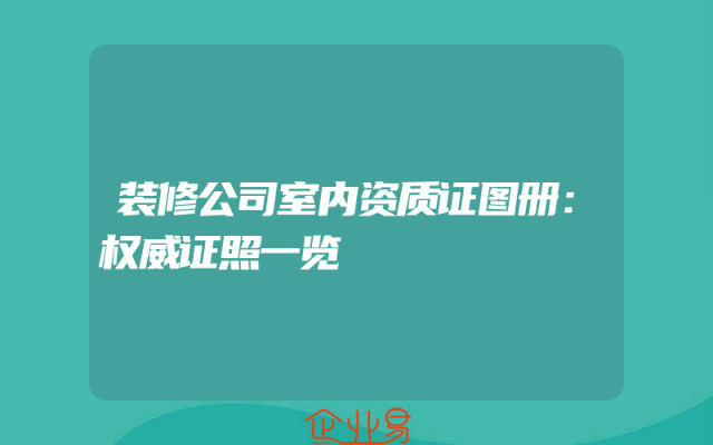 - 装修公司室内资质证图册:权威证照一览一、证照概述在装修行业中,室内装修公司的资质证是非常重要的,它不仅证明了公司的专业能力和业务资质,还是消费者选择服务的重要依据。随着装修行业的规范化和标准化,各类证照成为企业运营所必备的权威证明。