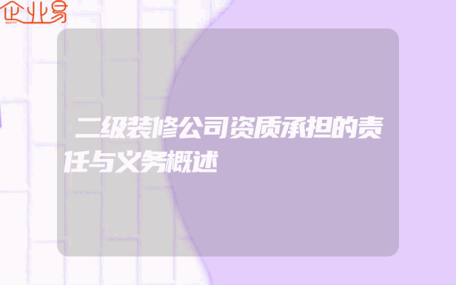 - 二级装修公司资质承担的责任与义务概述一、二级装修公司资质的定义及背景在我国装饰市场规范化管理的背景下,装修公司的资质成为了评估其能力、信誉和承担责任的重要指标。二级装修公司资质,作为其中一员,代表了公司在装饰行业中的专业水平和实力。获得此资