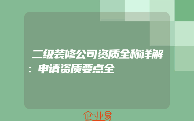 - 二级装修公司资质全称详解:申请资质要点全解析一、资质概述及重要性在企业服务行业中,装修公司的资质认证尤为重要。其中,二级装修公司资质作为专业性的认证标准,是评估装修公司施工能力和信誉的关键指标之一。拥有二级资质的装修公司能够证明其在