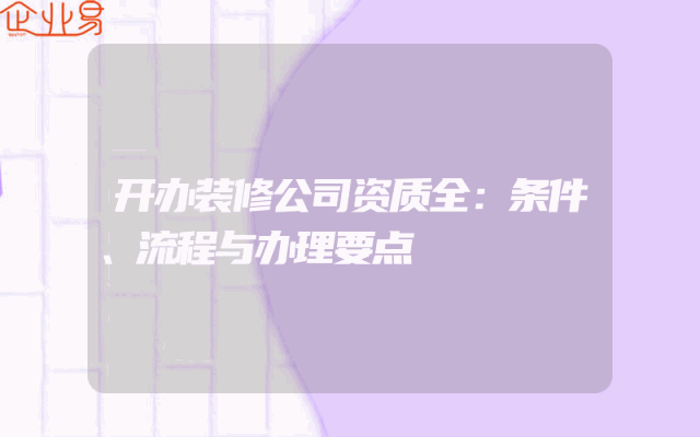 - 开办装修公司资质全解析:条件、流程与办理要点一、开办装修公司的资质条件在开办装修公司前,首先需要了解并满足相关的资质条件。这些条件通常包括公司的注册资本、从业人员的资质、经营业绩等方面。例如,公司注册资本需要达到一定的金额,以确保公司的经济