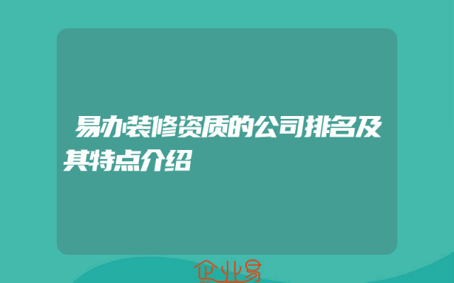 - 易办装修资质的公司排名及其特点介绍一、排名靠前的几家易办装修资质的公司随着装修行业的迅速发展,市场上涌现出了一批易办装修资质的公司。其中,排名靠前的几家公司在行业内树立了良好的口碑。二、第一家公司:XX装饰集团XX装饰集团以其深厚的行业背景
