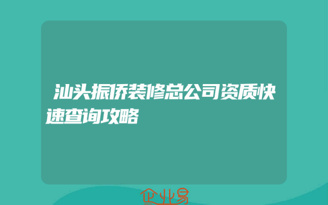 - 汕头振侨装修总公司资质快速查询攻略汕头振侨装修总公司是潮汕地区享有盛名的装修企业,为众多客户提供了优质的装修服务。为了确保公司合法合规经营,了解其资质情况尤为关键。以下是汕头振侨装修总公司资质的快速查询攻略。一、公司背景及基本信息查询首先,