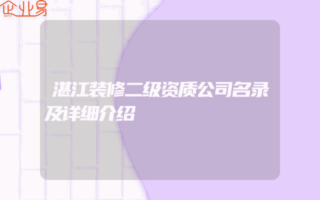 - 湛江装修二级资质公司名录及详细介绍一、湛江装修二级资质公司概览在湛江这座美丽的海滨城市,众多装修企业在激烈的市场竞争中脱颖而出,其中拥有二级资质的公司更是行业的佼佼者。这些公司以其专业的服务、过硬的实力,赢得了广大客户的信赖和好评。二、湛江
