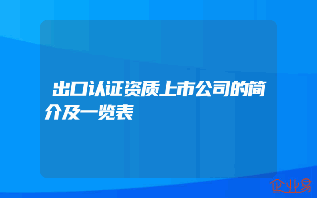 - 出口认证资质上市公司的简介及一览表一、公司概况在我国,随着国际贸易的不断发展,越来越多的企业开始走出国门,参与国际竞争。其中,一些企业在出口领域取得了显著的成绩,成为了行业的佼佼者。某公司便是其中的一家。该公司是一家专业从事出口贸易的企业,