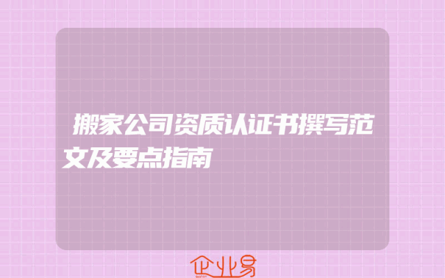 - 搬家公司资质认证书的撰写范文及要点指南一、搬家公司资质认证书的重要性随着搬家服务市场的快速发展,消费者对搬家公司的服务质量和信誉度要求越来越高。资质认证书是反映搬家公司服务能力、管理水平、服务质量的重要依据,对于搬家公司而言,获得资质认证书